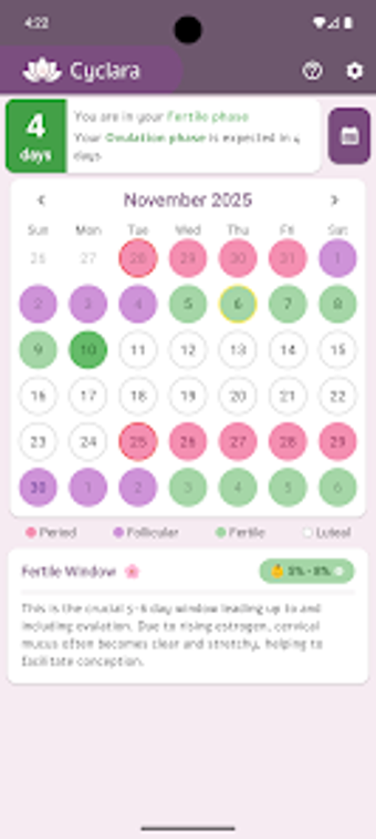 Cyclara เป็นแอปพลิเคชัน Android ที่ออกแบบมาโดยเฉพาะสำหรับผู้หญิงในการติดตามสุขภาพประจำเดือนอย่างมีประสิทธิภาพ มันมีฟีเจอร์ต่าง ๆ เช่น การติดตามรอบเดือนที่แม่นยำ การคาดการณ์การตกไข่ และข้อมูลเชิงลึกเกี่ยวกับสุขภาพรอบเดือน ช่วยให้ผู้ใช้สามารถบันทึกรอบเดือนของตนได้อย่างง่ายดาย อัลกอริธึมอัจฉริยะจะพัฒนาขึ้นเมื่อเวลาผ่านไป ทำให้การคาดการณ์สำหรับรอบเดือนและช่วงเวลาที่มีความ fertile มีความแม่นยำมากขึ้น ผู้ใช้สามารถดูรอบเดือนของตนในรูปแบบปฏิทิน ซึ่งช่วยในการระบุรูปแบบและแนวโน้มเมื่อเวลาผ่านไป